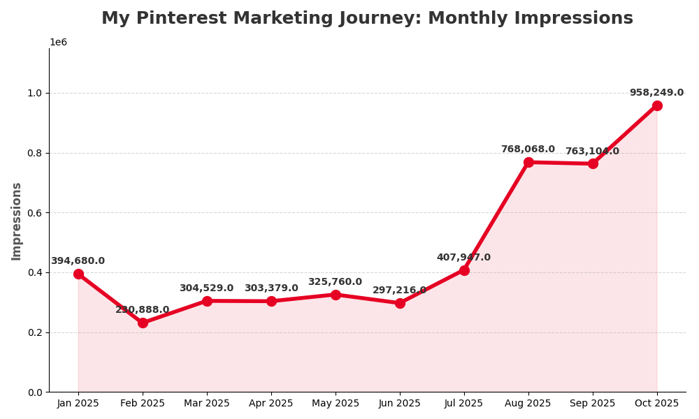 While pinning once a day, it took me a little under two years to hit the 500,000 monthly views milestone, but the good thing is that soon after, my growth skyrocketed to over a million impressions.